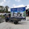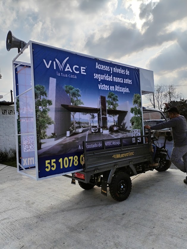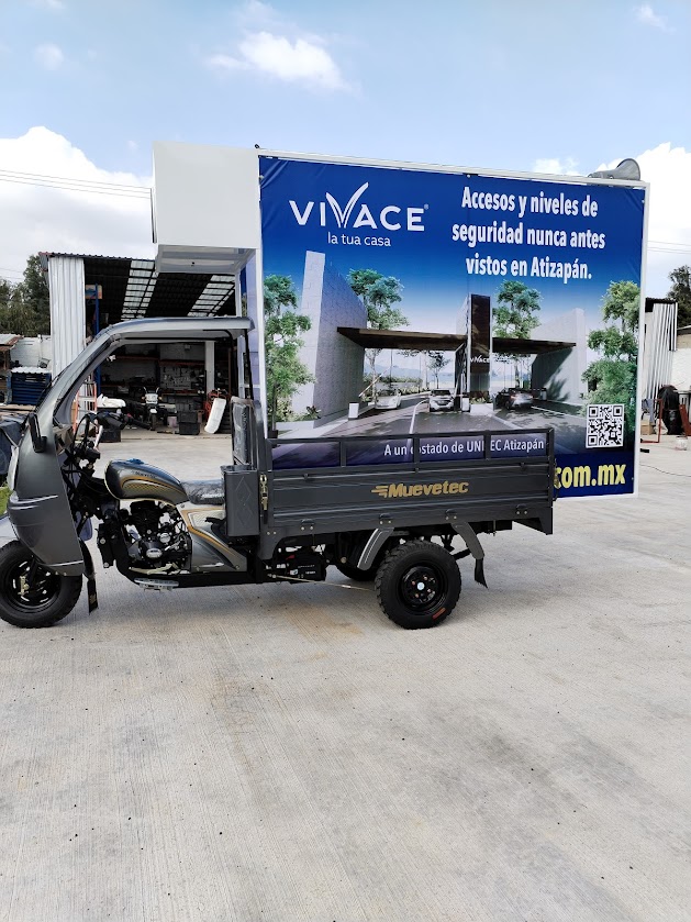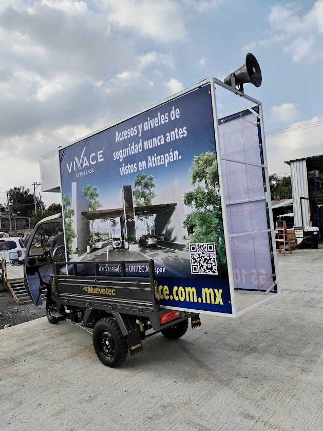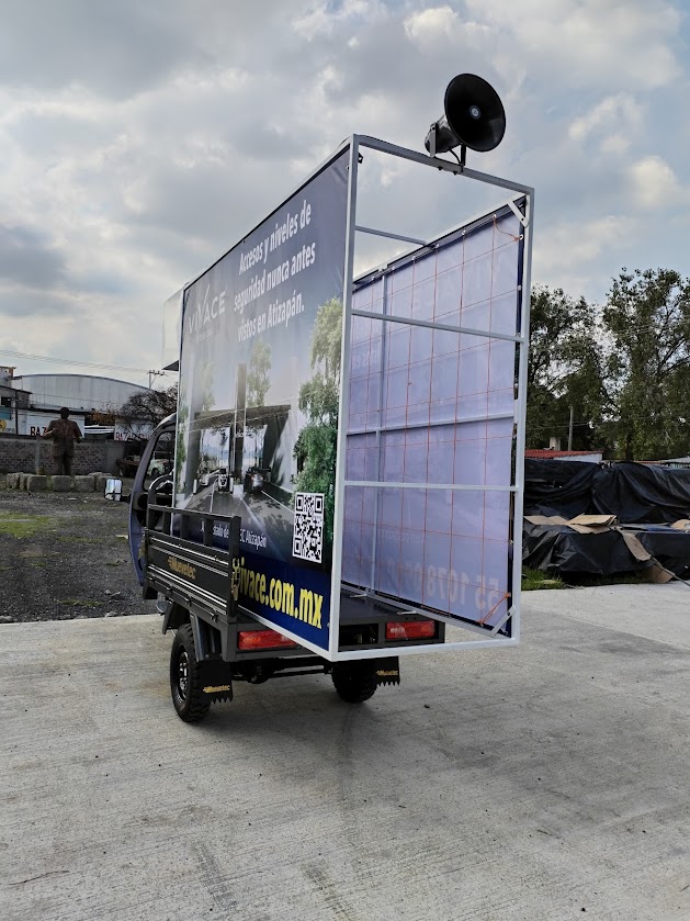 • Valla publicitaria m贸vil en motocarro: estructura instalada en la batea con marco para lona intercambiable, lista para rotar mensajes y creatividades seg煤n la campa帽a.